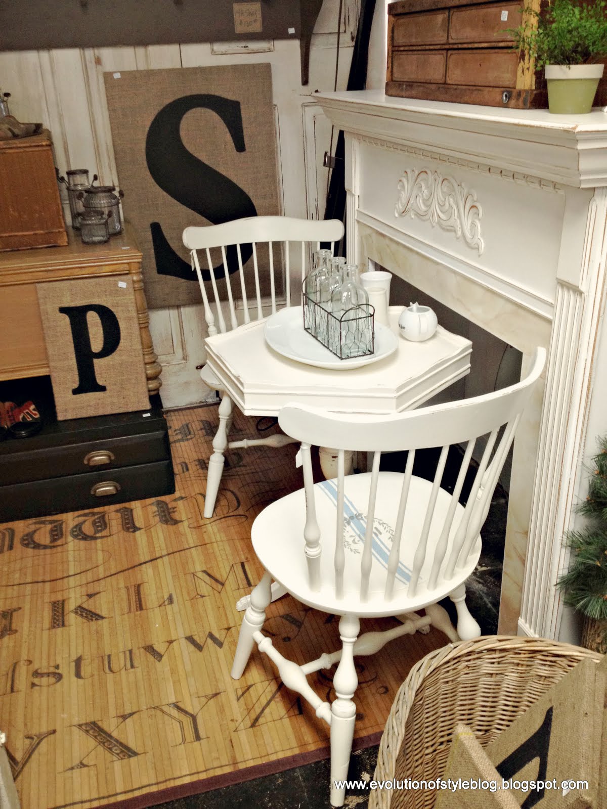 A sweet table and chairs, and I love the wire basket with the trio of bottles.
