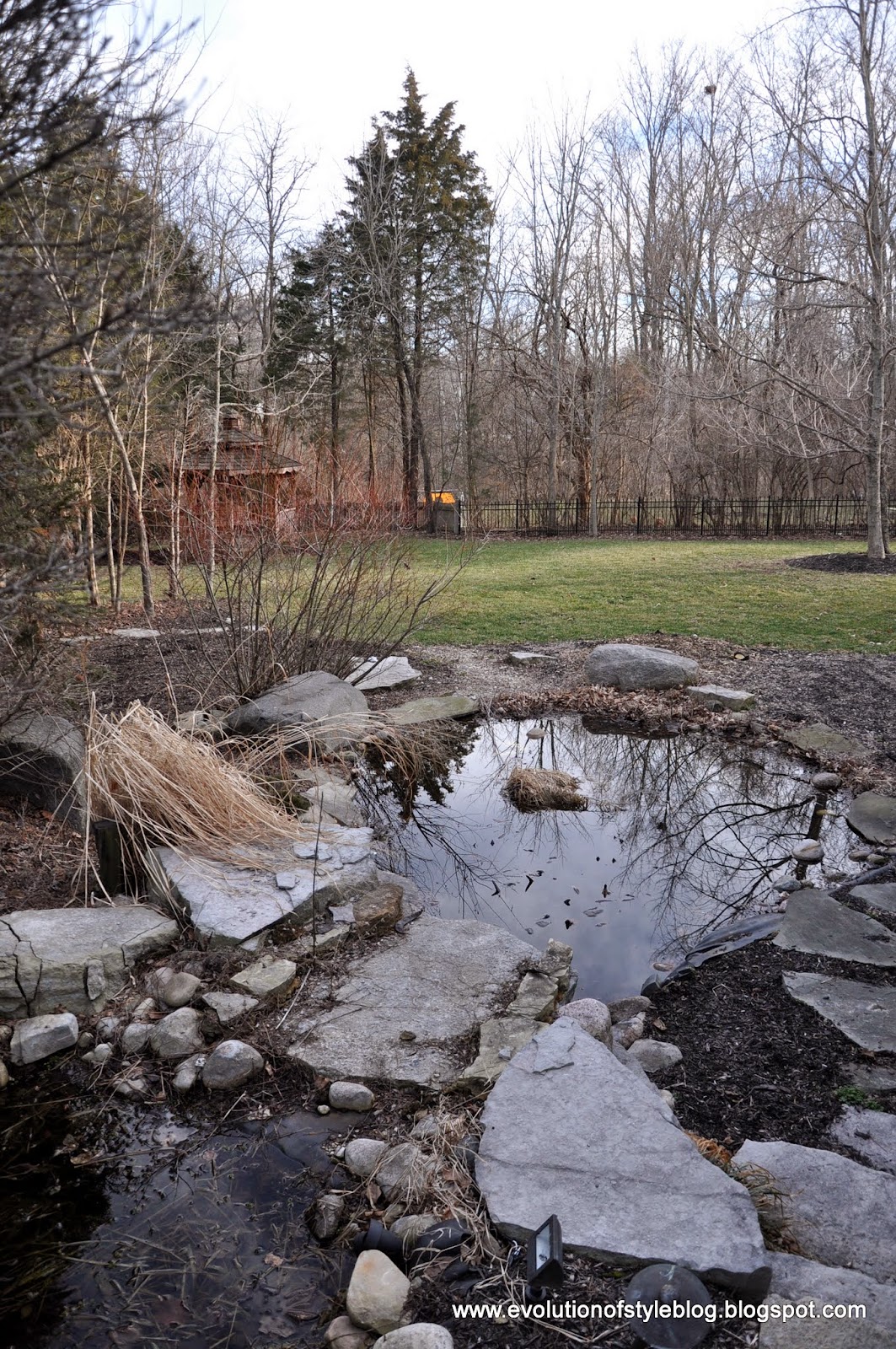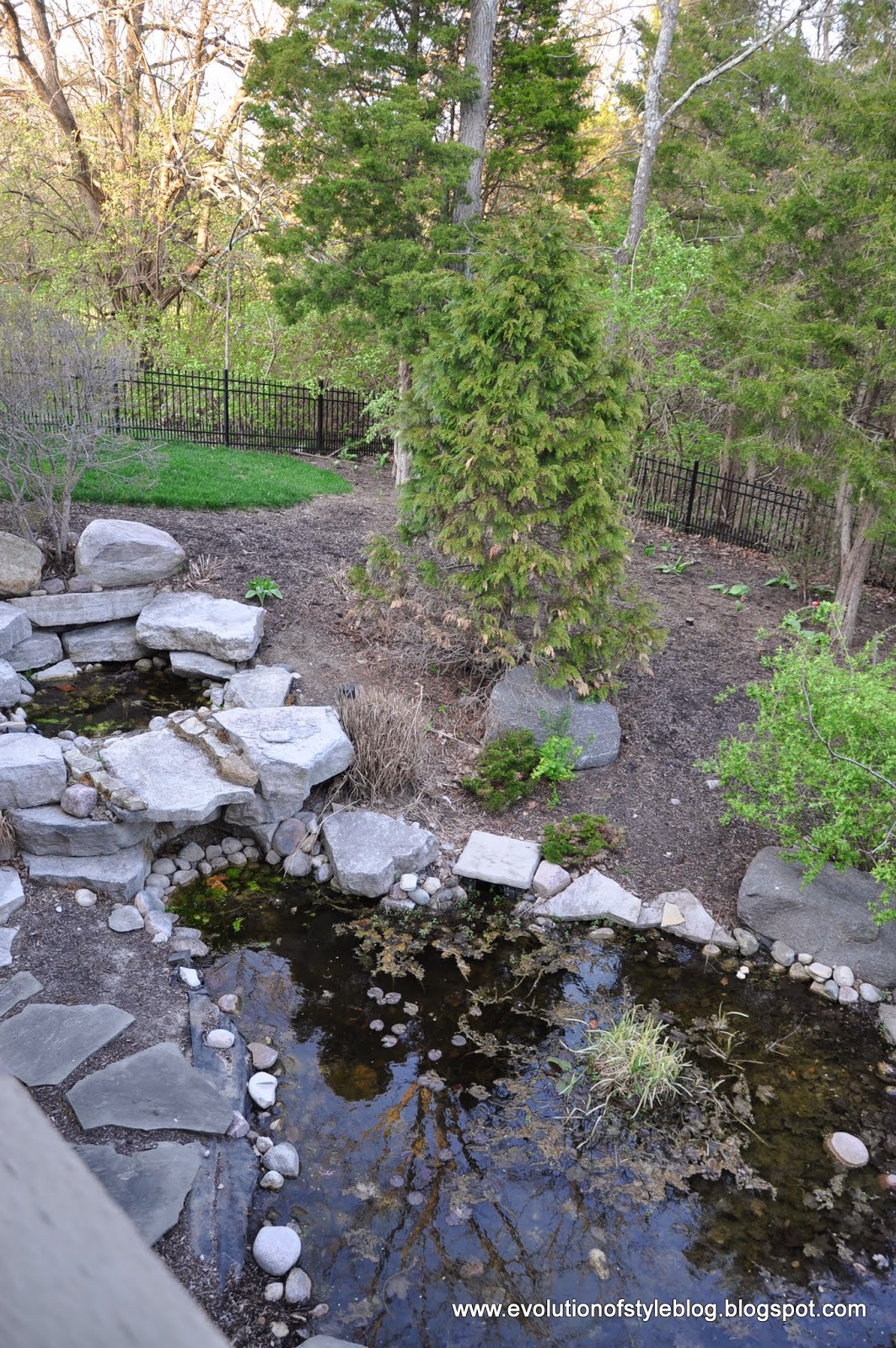 This is probably the one time that the pond looked nice while we owned the house – and you can sort of see the bottom. We had just paid a professional to drain it and clean it (talk about a dirty job). This lasted for maybe … 14 minutes.