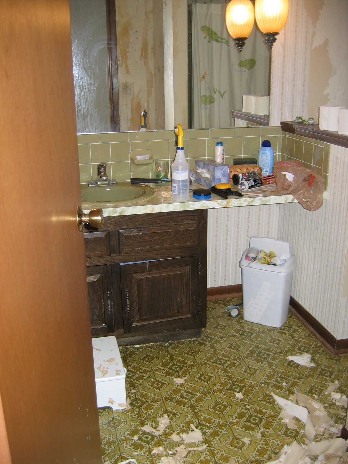 The project I’m featuring here was actually a “surprise bathroom makeover” for one of my best friends. I managed to conspire with her husband to get access to their house while they were away on vacation. I must say up front, that this transformation effort began with a modest plan – finish the wallpaper stripping that my friend had started, paint, new towels, perhaps replace the countertop, etc… However, this project soon turned from “D-I-Y” to “D-I-Why?”. It was one of those projects where one thing led to another, and the project just took on a life of its own. “If I redo the countertop, I’m going to have to redo the floor. If I redo the floor, I can’t leave the lighting the way it is…” You get the picture. That’s where I started asking myself, “WHAT have I gotten myself into?” Past experience tells me that this feeling usually rears its ugly head when the project looks the absolute worst. During this project, I reached that phase right about here…