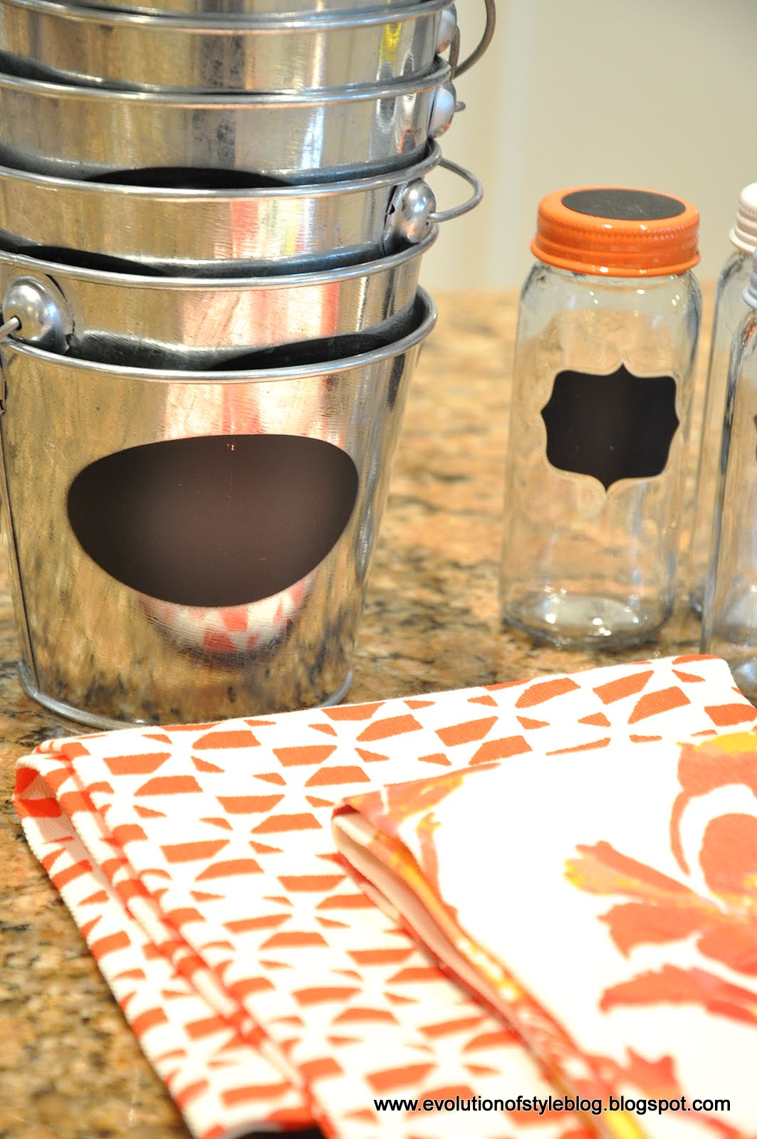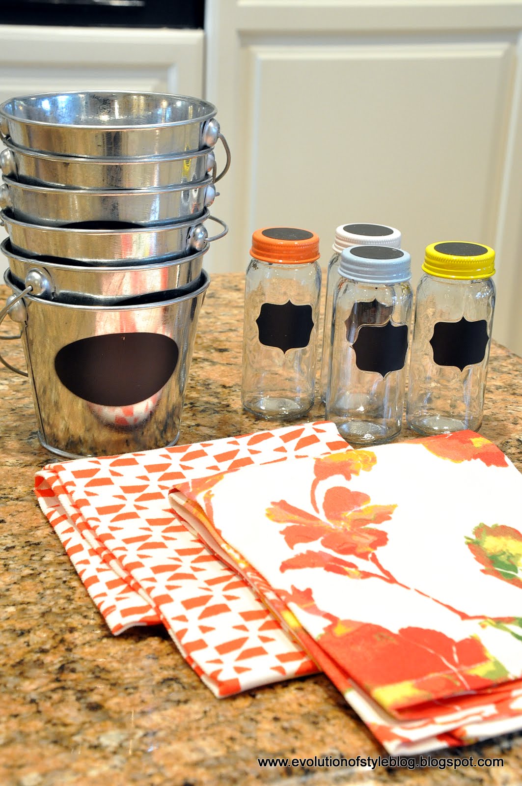 I’m loving all things chalkboard right now, so you can imagine why I snapped up these cute little chalkboard labeled buckets ($1 each, thank you very much). And just how is a girl supposed to resist chalkboard labeled spice jars with lids in lovely spring hues? Throw in some tangerine kitchen towels, and I’m a happy camper. (Still cold, but happier).