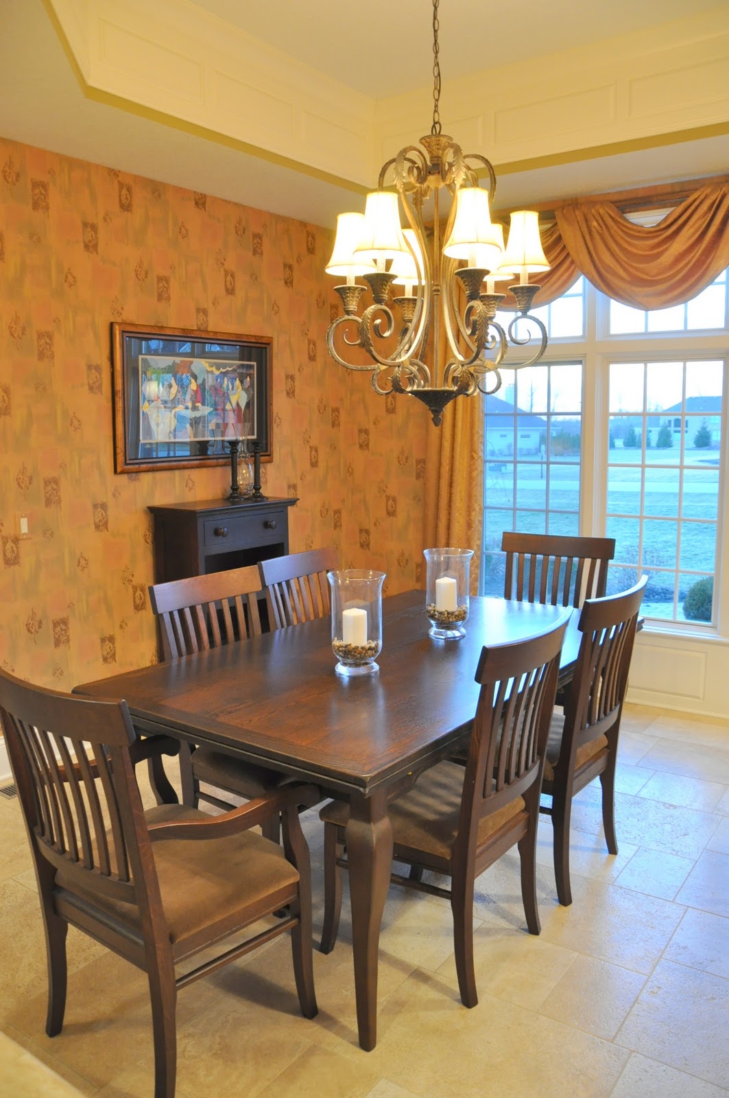I love everything about this room! The colors, the banded draperies, the chandelier, the light and bright feel of the room – everything. Plus, I love that this room has many of the same features of our dining room. The same layout, even the same windows.