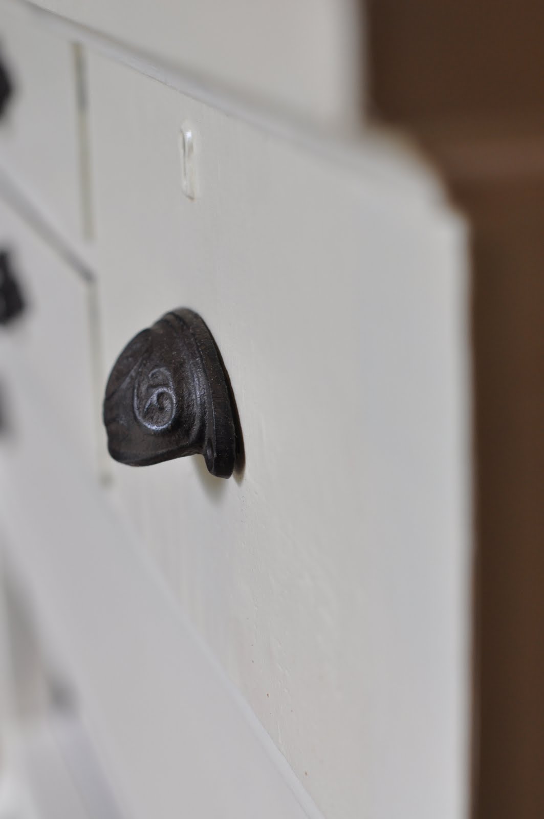 I decided to do away with the bottom drawer altogether since it was in such bad shape and the drawer track was broken, and instead opted to create a little shelf along the bottom with a pretty basket. I also changed out the drawer pulls for these pretty vintage ones from Hobby Lobby.
