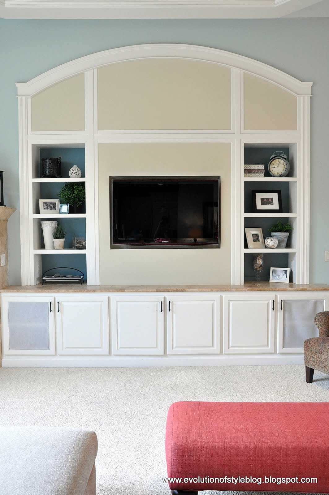 September 11, 2012 at 1:26 pmI like the white on the built ins. What about something like a graphic or vintage clock in the space over the TV? I think it needs something up there, but I do like the white. It looks much cleaner.
