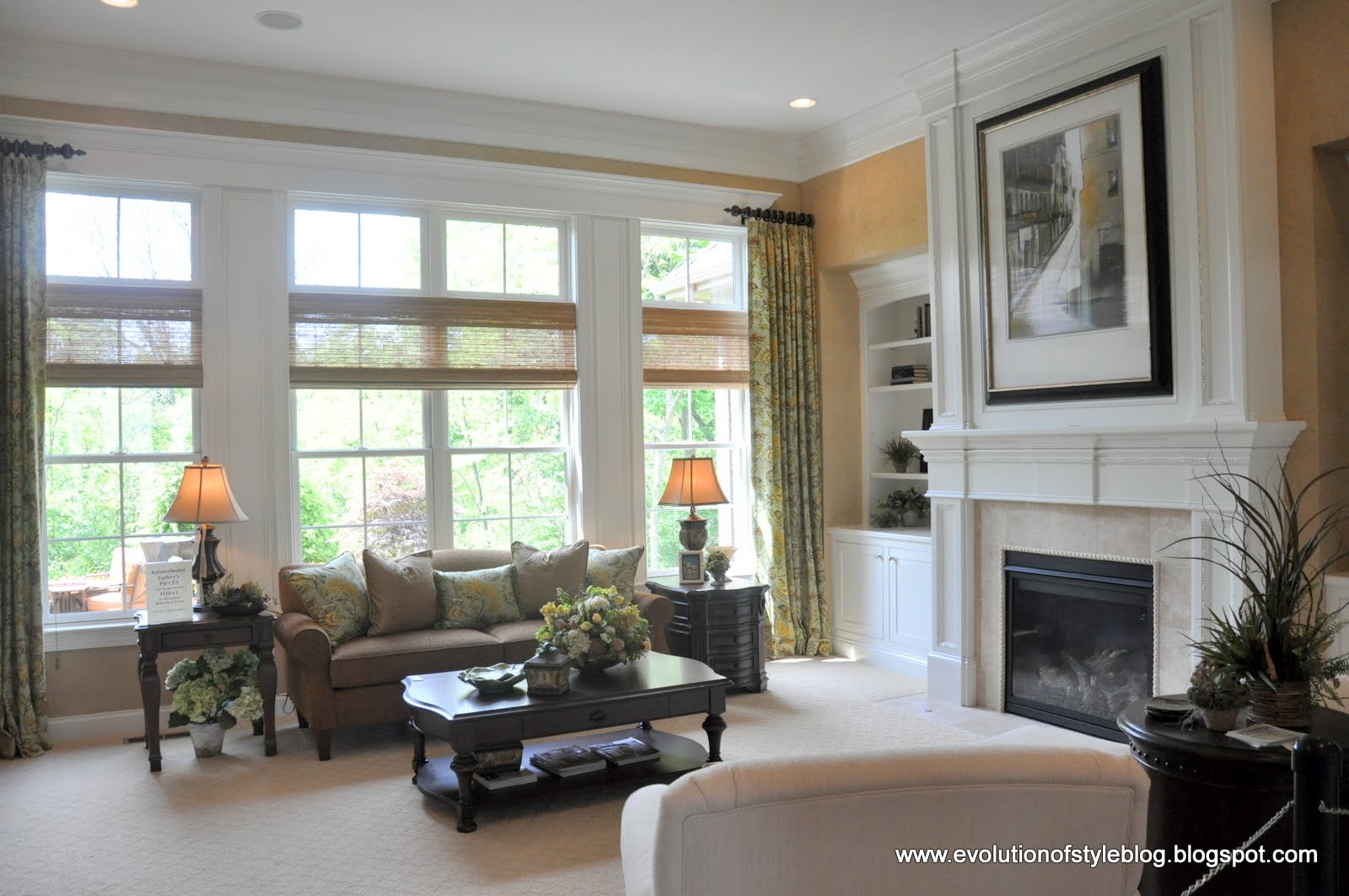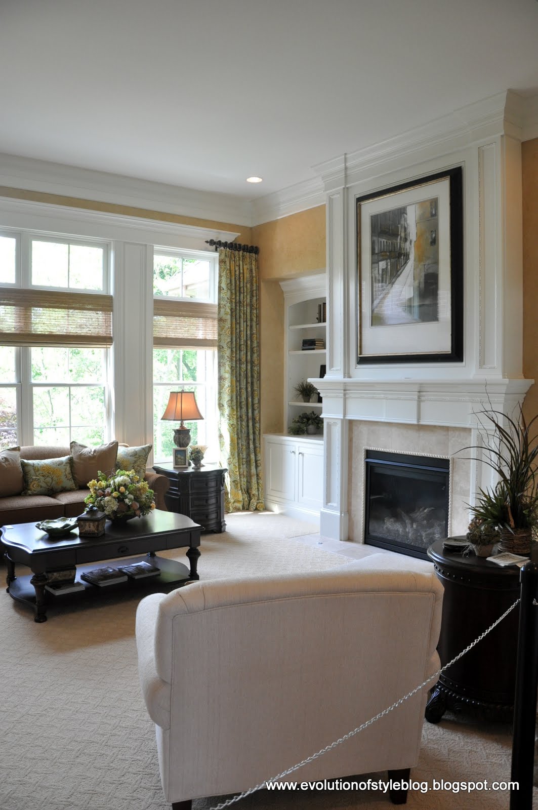 The family room was straight ahead, with a bank of transom windows, and a fireplace flanked by built-ins. This room definitely has a more “formal” vibe to it than some of the others – do you think it’s because there is carpet in here vs. the hardwoods flowing through?