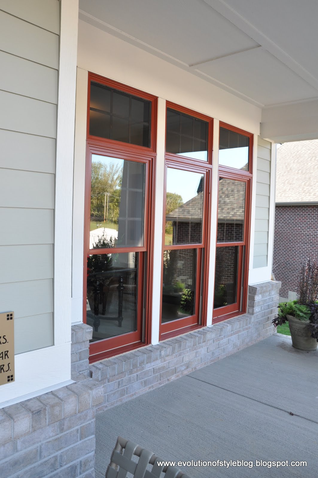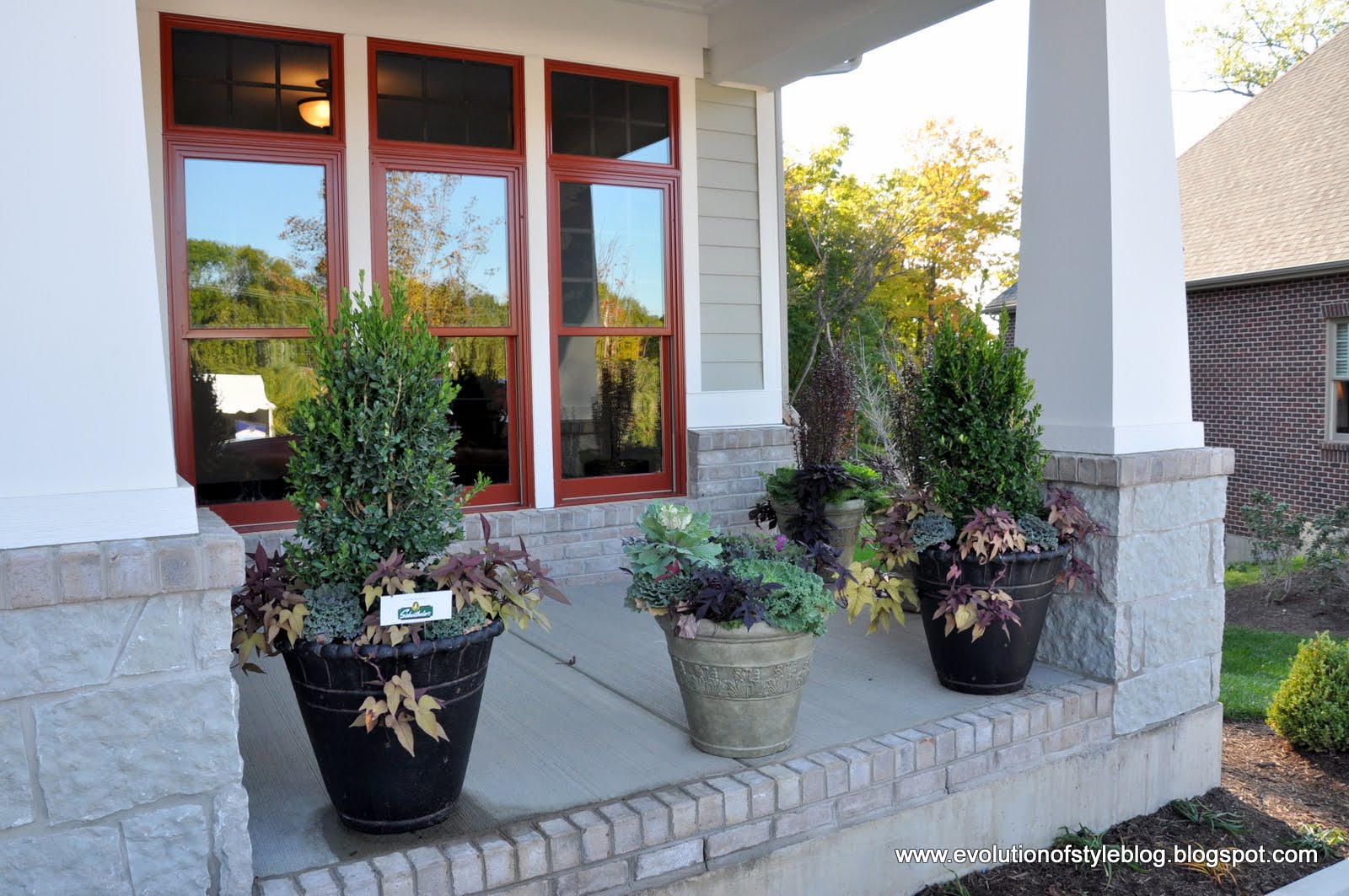 Cute front porch with some gorgeous planters, and I love the red transom windows.