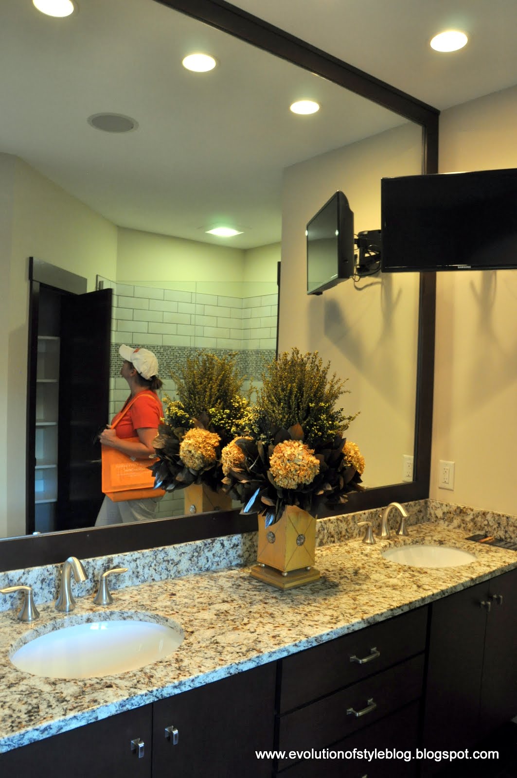 Beautiful vanity and I liked the framed mirror in here. One thing I did notice about this home is the interior doors (although I don’t have any great photos – but you can sort of see it in the bathroom below). They were very plain and had a modern look to them with a brushed nickel handle-type of “doorknob” – almost like an office door. I didn’t like it – didn’t jive with the craftsman style to me – especially after seeing such an impressive front door and beautiful windows with such great details.