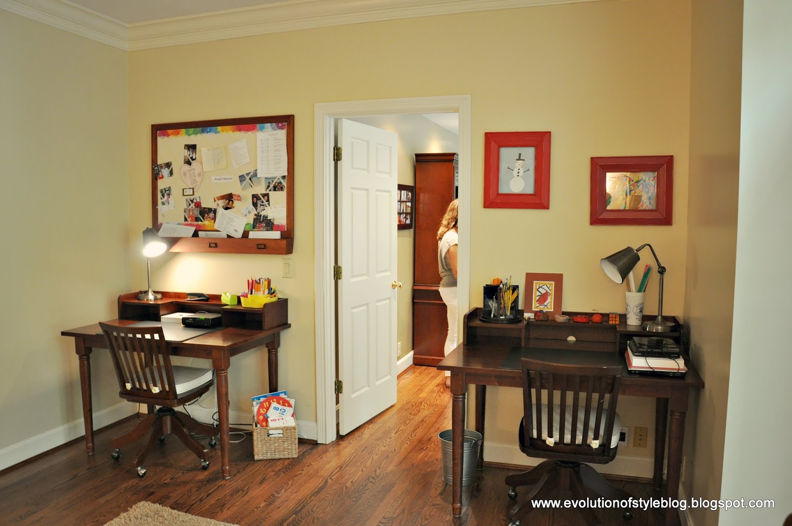 I love this room! Then, the door between the desks leads to her husband’s home office.
