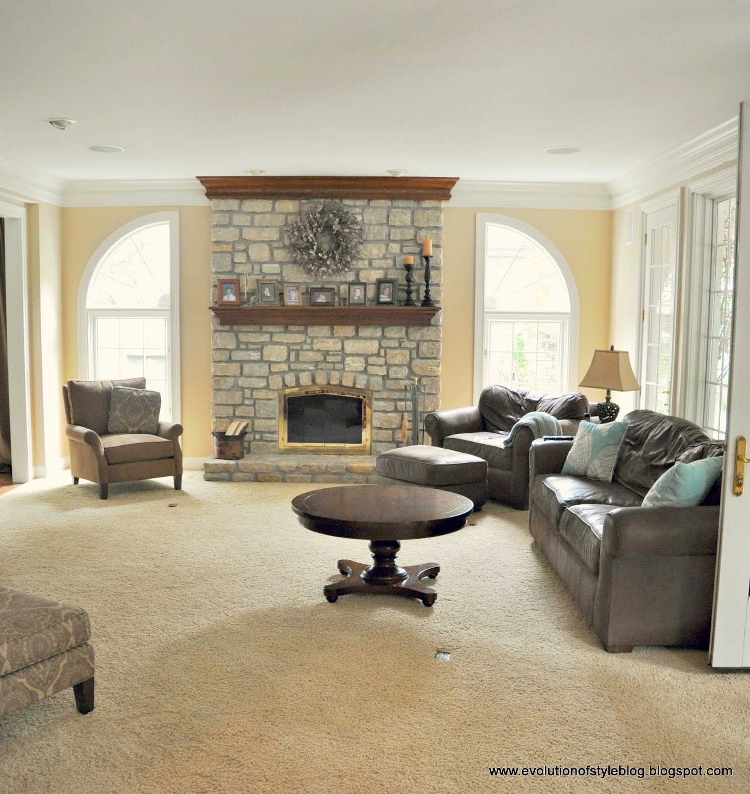 To the left is the living room. I love the wall color, large transom windows, and I think the rug is my favorite.