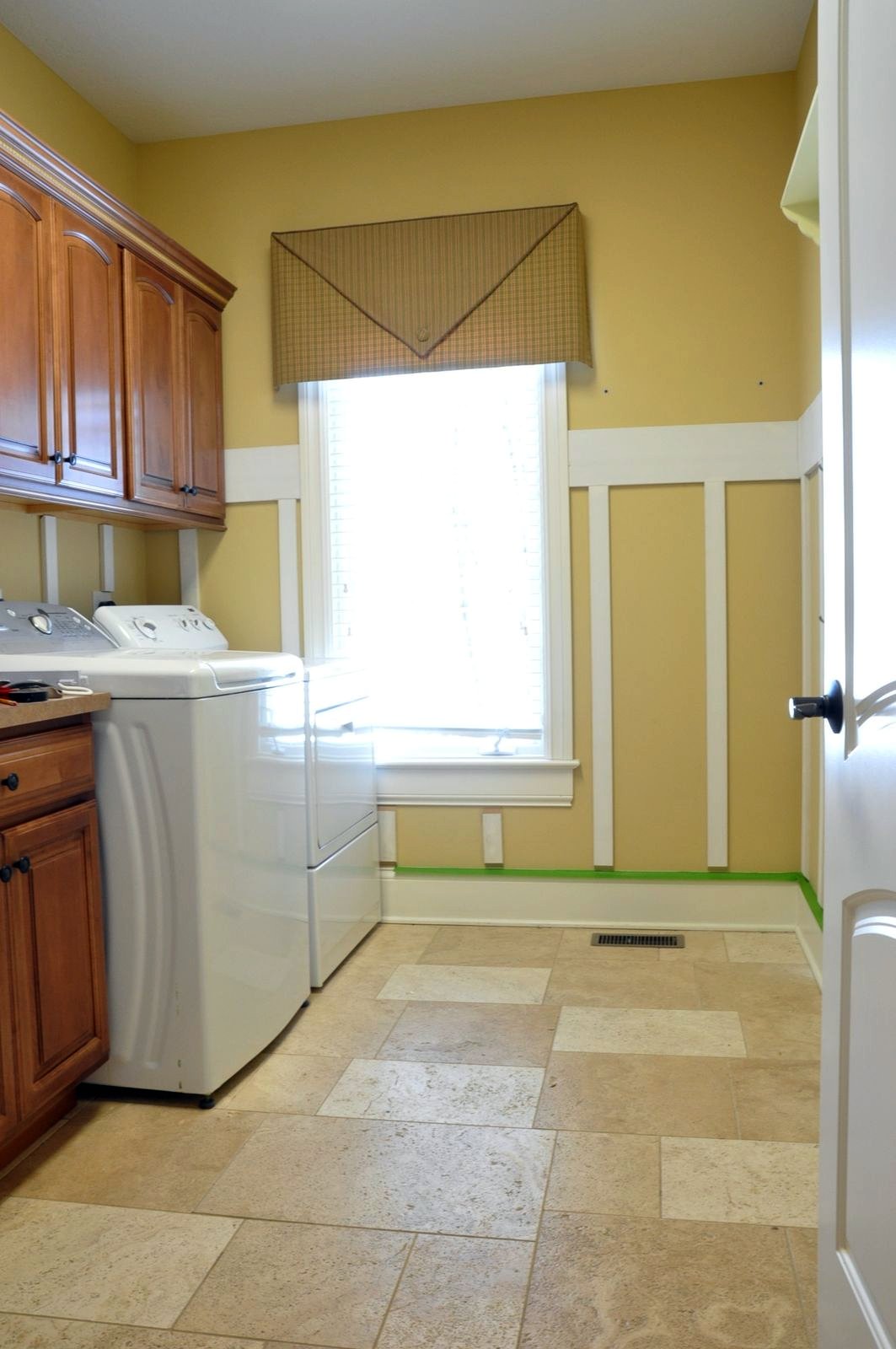 While I love the look of board and batten, I must say, of all rooms in the house, I think I loathe painting the laundry room the most. I become “Crouching Mother, Hidden Painter” working behind the washer and dryer, but there is just no easy way around it. (Especially since I didn’t think to do it before we moved in. When the room was empty.)
