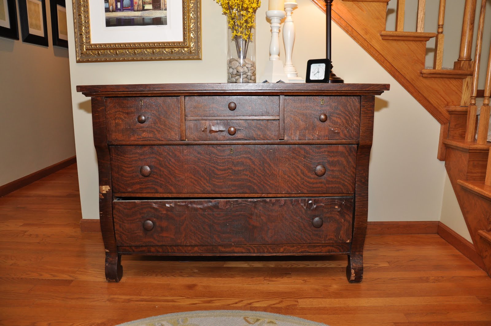 I bought this lovely lady on craigslist awhile back, and have been using it in my foyer as an entry table/great piece for throwing crap when people are coming over and I’m cleaning up in a hurry. But, it’s kind of on the heavy side (no offense my lovely lady, I’m NOT calling you fat, I promise. If anything, you’re “PH” phat). Plus, some of the veneer on the drawers and legs has been chipping (and in one case was actually torn off by carpet cleaners who were dragging their stuff through my house). And, the bottom drawer didn’t open/close easily at all.