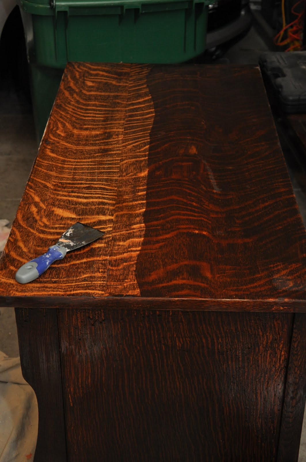 With our house up for sale, I’m always paranoid that I’ll get into a project and then have someone schedule a showing while the house is in the mid-project-mess stage. But, I figured since we didn’t have any showings scheduled last weekend, that I would be “safe” to knock this thing out. Well, I was good on Saturday, made some progress, but probably inadvertently wasted time as I used Citristrip to strip this piece (and another painted side table). Probably didn’t need to do that for this project, but oh well, live and learn. I thought at one point it would be good to get all of the varnish/stain off of this and start fresh. You can see what it does though – good stuff!