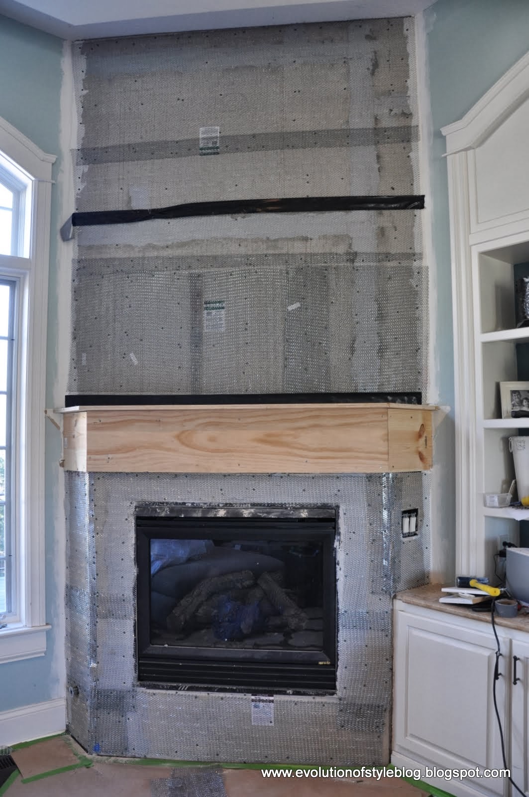 And, I faced my mortar-fear by trying the mortar mixing again. I used a big plastic tub instead of a five gallon bucket, and that seemed to do the trick. I completed the scratch coat on the bottom portion of the fireplace (to aid in successful stone adhesion), and have made progress even since I took this photo (and subsequently ran out of mortar). A stone mason, I am not. This stuff is messy. But, it’s progress.