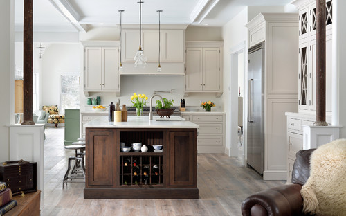 This kitchen embodies exactly what I’m talking about, when I say that a kitchen can be light, bright and timeless with cabinets that aren’t white. It’s so classic and elegant, I can hardly stand it. The paint color on the perimeter cabinets is Flagstone, but this is via Houzz, and they didn’t provide the paint company. It also might be a color that is associated with the cabinet maker, I can’t be sure. Either way, if you find a color that is from a cabinet maker, you can always have it color matched if you’re looking to have your kitchen cabinets painted. That’s what I did when I painted my kitchen cabinets.