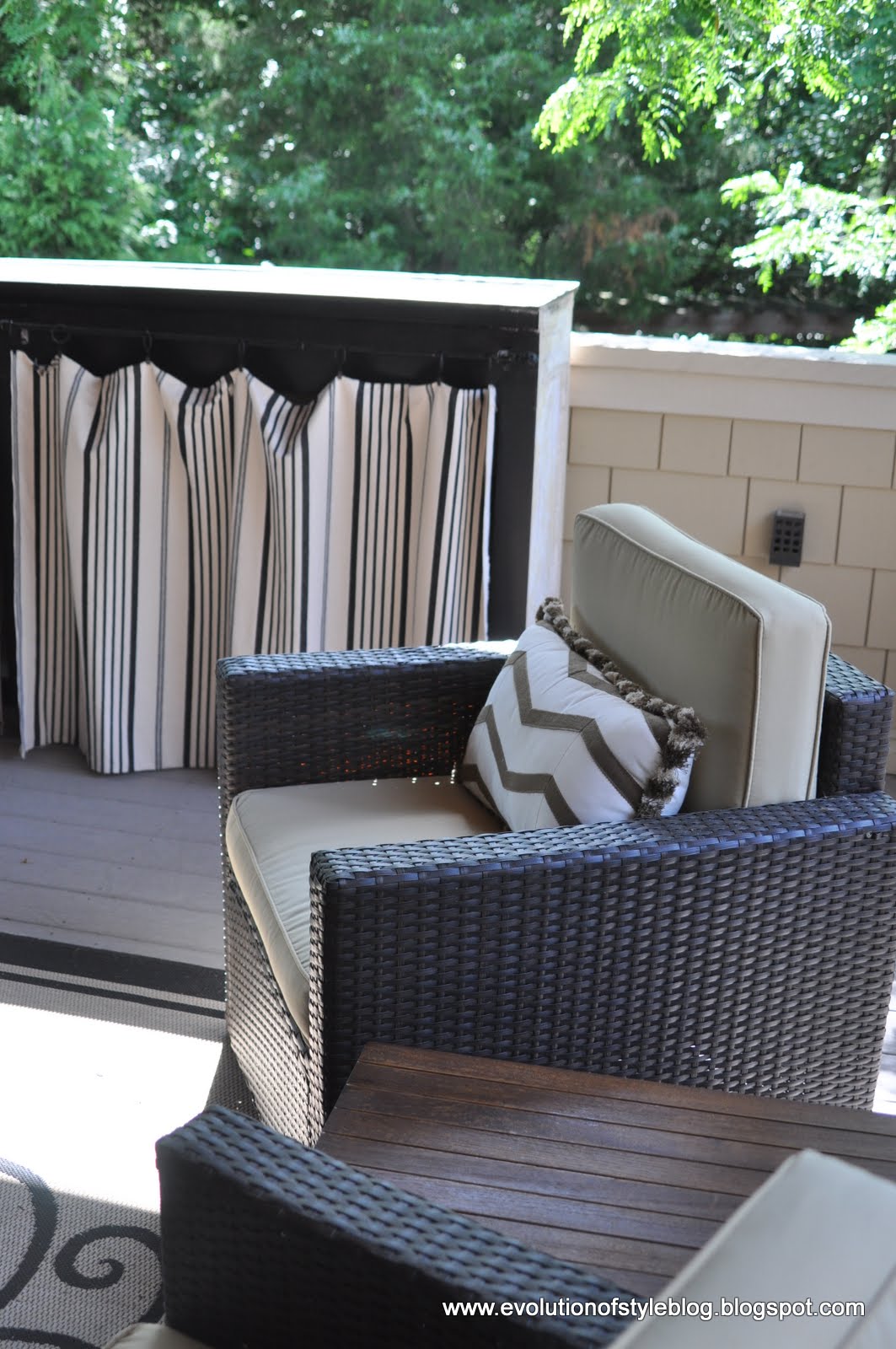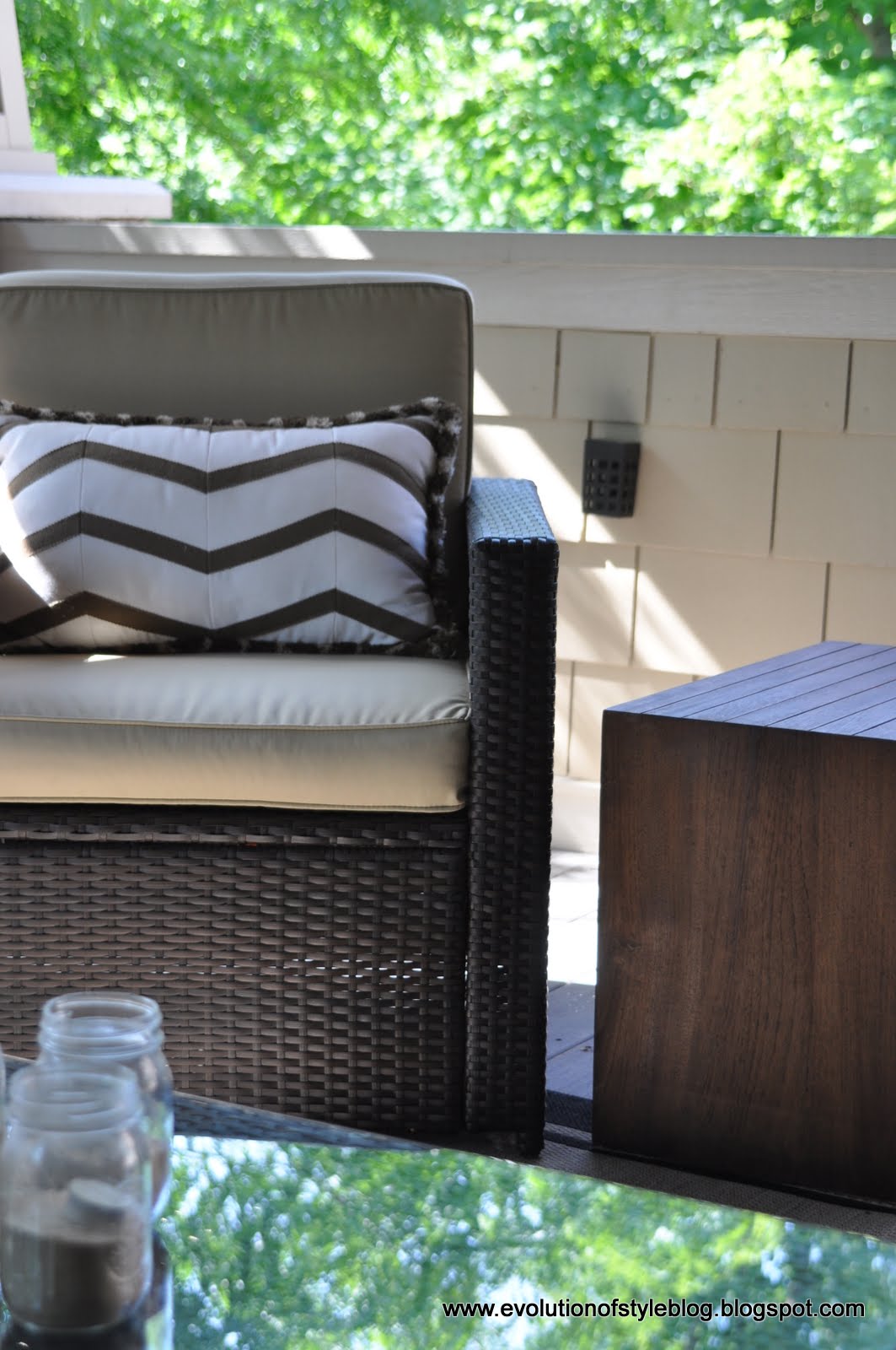 And for the moment, this little lovely has found a home on our back porch. I’ve been looking for some side tables to accomodate the space between the chairs we have out there, and this one fits the bill.